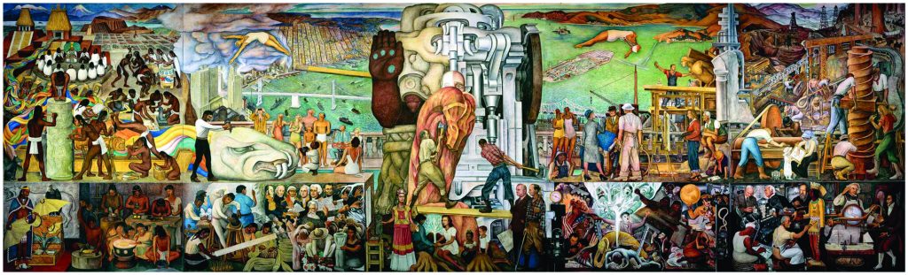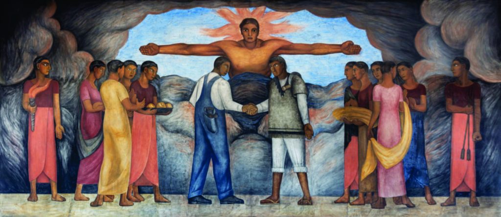 Diego Rivera en formas clasicista, simplificadas y con vivo colorido, rescató el pasado precolombino, los momentos más significativos de nuestra historia, la tierra, el campesino y el obrero, las costumbres, y el carácter popular. Fue un pintor revolucionario que buscaba llevar el arte al gran público, a la calle y a los edificios, manejando un lenguaje preciso y directo con un estilo realista, pleno de contenido social.