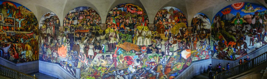 Pero donde verdaderamente Diego Rivera creó una imagen visual de la identidad mexicana moderna fue en los frescos que, a partir de 1929 (año en que fue expulsado del partido comunista por presentar ciertas discrepancias), pintó en el Palacio Nacional de México. Es su gran obra, y en ella Rivera ilustra la historia de México desde época precolombina. Los murales ocupan las tres paredes que se encuentran frente a la escalinata principal del edificio. Mientras que la pared central abarca el período que va desde la conquista española de México en 1519 hasta la revolución, en el de la derecha el artista describe una visión nostálgica e idealizada del mundo precolombino, y en el de la izquierda plasma la visión de un México moderno y próspero.