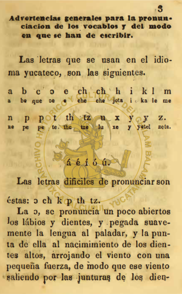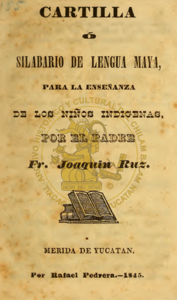 Estes documento facsimilar, fue escrito por el Padre Joaquin Ruz para enseñar a los niños indigenas la forma de escribir en el Idioma Maya, fue impreso en Mérida en el año de 1845, intitulado como